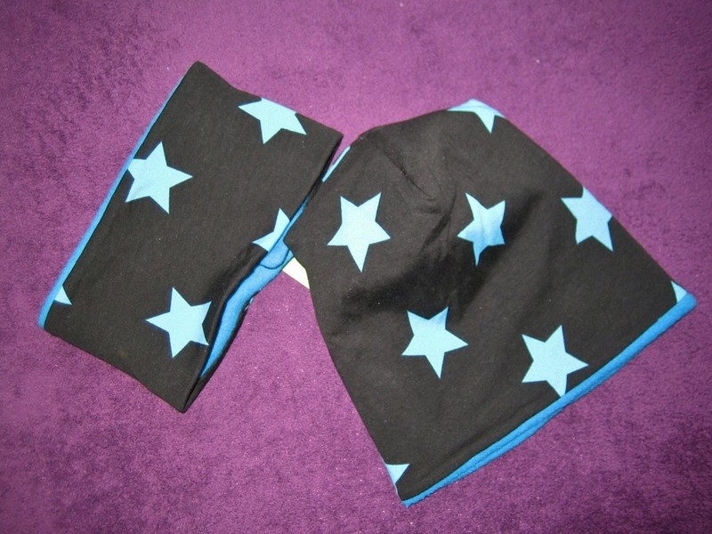 Ausgefallene Jersey Wendemützen , je nach Wunsch mal mit Loopschal - einfachem Loop oder für die Kleinsten zu knöpfen kombiniert